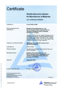 公司嚴格按ISO9001:2015《質量管理體系—要求》、ISO14001:2015《環(huán)境管理體系 要求及使用指南》、ISO 45001:2018《職業(yè)健康管理體系 要求及使用指南》和TSG 07—2019《特種設備生產和充裝單位許可規(guī)則》,建立完善的管理體系。公司擁有國內較大的12000KN冷拔機組和先進的全溫控不銹鋼固溶退火爐等生產設備,同時具有ET16-159渦流探傷儀、UT16-159超聲波探傷儀、UT159-830超聲波探傷儀、H159-630水壓試驗機、WAD—600液壓材料試驗機、4XB電腦金相顯微鏡、JQ—300沖擊試驗機、HBRVU—187.5硬度計、島津光譜儀、化學分析儀、晶間腐蝕試驗等完善的檢測設備。